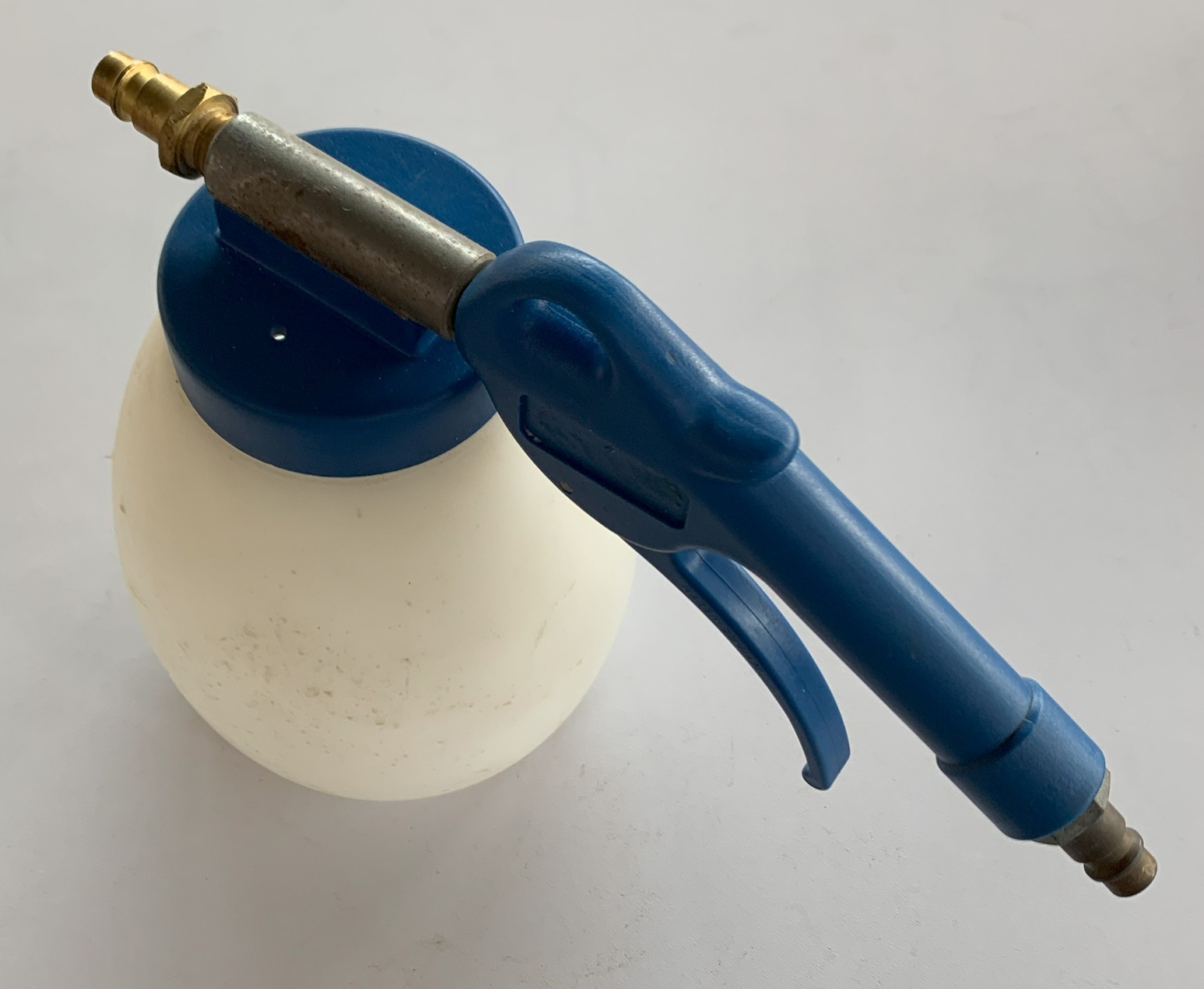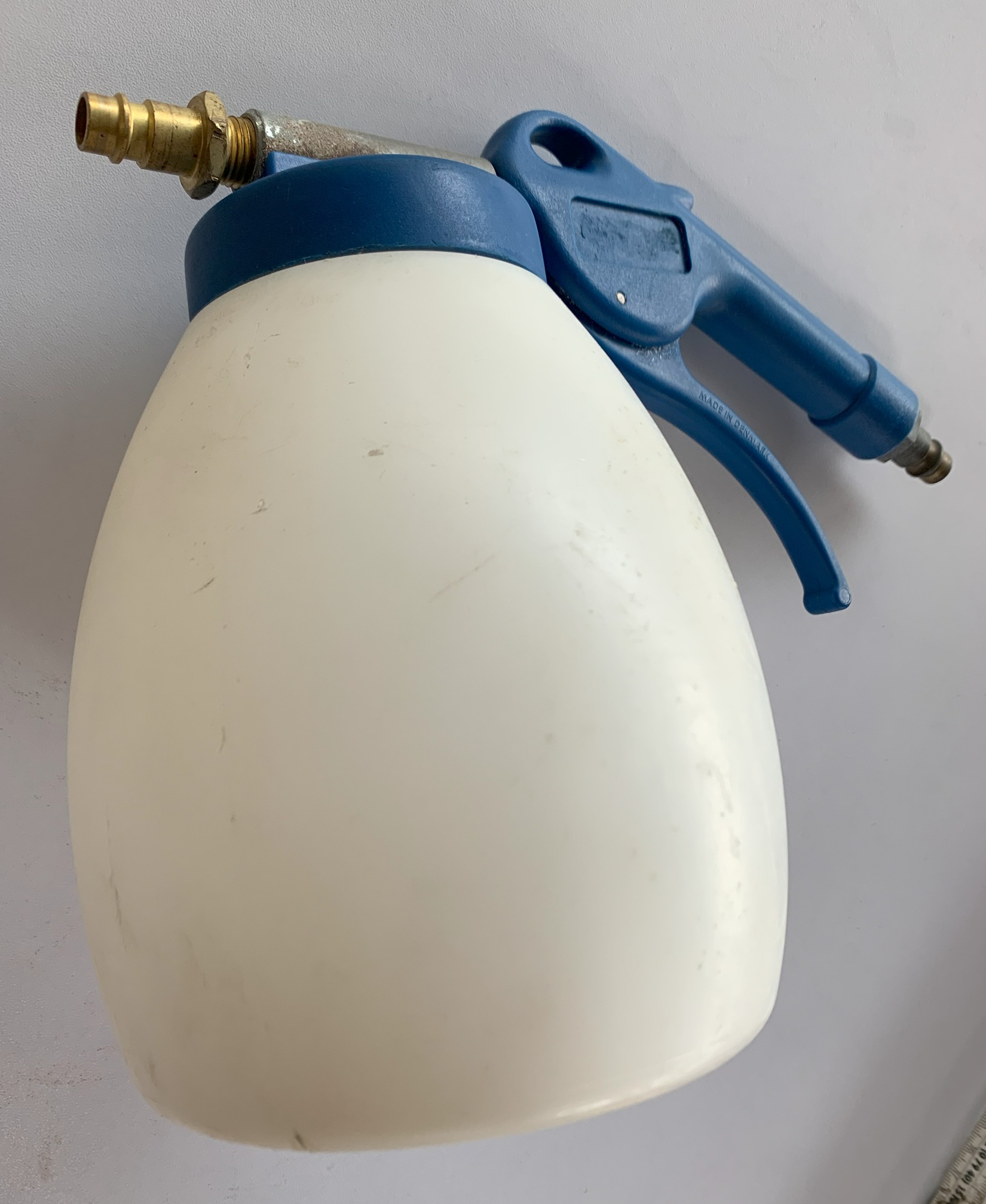 Sonderposten, benutzt, leichte Anrostungen, Sonderdüse mit größerem Durchmesser von ca. 8 mm (nicht original), schmutzig: Natron-Strahlpistole (Sodastrahlprinzip) Injektor, Standard-Profiversion mit Grundausstattung, erforderliche Luftleistung 180-500 L/min bei 6 bar (je mehr Leistung, desto schneller der Abtrag), Öffnungsgröße Strahldüse vorne 4,5 mm (Luftdüse 2 mm), Handgriff aus Kunststoff incl. Druckluftanschluß (Aussendurchmesser 12 mm, Durchsatz 7,7 mm), massiver Becher ebenfalls aus Kunststoff (Durchmesser 127 mm, für ca. 1 kg Strahlgut), LxBxH=255x127x197 mm, Gewicht 564 gr., Tipp: Benutzen Sie bei dieser Natron-Strahlpistole kein anderes Strahlmittel, da der Abrieb die Pistole dann beschädigen würde, Natron/Sodastrahlen ist ein schonendes Reinigungsverfahren zum Entfernen von Farbe, Schmutz, Schimmel etc. Umweltfreundliches Strahlen an Fahrzeugen, an und in Häusern, an Booten etc. Die Oberfläche wird beim Natronstrahlen nicht erwärmt und somit auch nicht beschädigt, Glas, Gummi oder Chrom können somit auch bestrahlt werden. Achtung: Aufgrund der hohen Verdichtung des Strahlmittels beim Strahlen, die Pistole immer wieder schütteln! Beim Naßstrahlen bitte beachten, dass die bestrahlte Oberfläche dann schnell rostet und das Strahlgut-Feuchtigkeitsgemisch an den Oberflächen haftet und nur schwer entfernt werden kann.