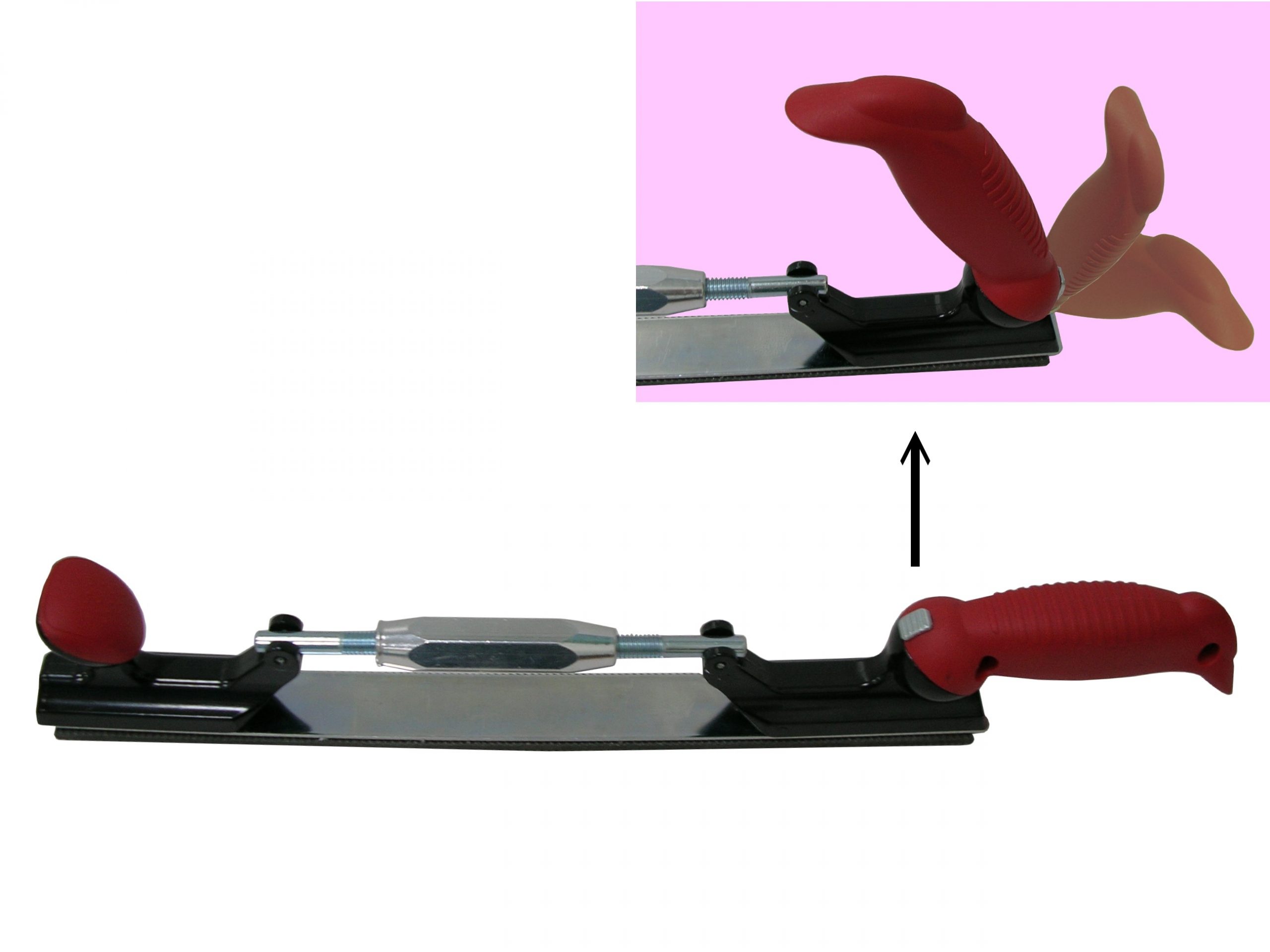 Neuer, verbesserter Karosserie-Feilenhalter Profi, griffsicherer Handgriff drehbar, Lieferung ohne Feilenblatt (optional ZB 1025 FB oder ZB 1057 FBI1-350), insgesamt 5 Stück Lochbohrungen für Montage unterschiedlich langer Feilenblätter, LxBxH=365 (mit gedrehtem Handgriff 470 mm)x40x140 mm, Gewicht 702 gr.