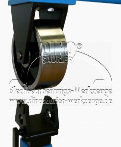 Rollenstreckmaschine Standgerät, Profigestell für Stahlbleche bis 1,2 mm (Alu bis 1,9 mm), incl. 5 Stück untere Standard-Formrollen (Radius: 47+55+75+220+1.000 mm Radius, Durchmesser 75 mm, Breite 75 mm), Ablageblech für untere Formrollen mit Schließbügel, oberes Rollenrad (Durchmesser 195 mm, Breite 75 mm), Verstellmöglichkeit der Achsrichtung des oberen Rollenrades, Schnellmechanismus, Vorrichtung zum leichten Transportieren der Rollenstreckmaschine per Hubwagen und Standgestell mit Laschen (mit 2 Bohrungen 12 mm und 2 Bohrungen 11 mm zum Befestigen am Boden), Schmiernippel zum Fetten des Stempels, Hub/Öffnungshöhe max. 25 mm, Arbeitstiefe bis Mitte der Rollen 1.040 mm, Arbeitsraumhöhe innen 760 mm, Arbeitshöhe 1.150 mm, LxBxH=1.430x745x1.795 mm, Gewicht ca. 140 kg, Hinweis: Oberes Industrierollenrad und untere Industrierollen in Stahl und Kunststoff können einfach nachgerüstet werden