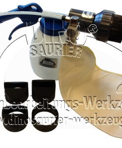 Rücksaugvorrichtung für SP 700 SOD2 (bei SP 705 NAD3 vorne nicht so fest), sofort einsetzbar (besteht aus Druckluft-Rücksaugeinheit, Bürsten-/Düsenhalter, Rücksaugsack und Bürstenaufsatz, Hinweis: 4 Stück Gummidüsen für unterschiedliche Anwendungen zusätzlich lieferbar), zum einfachen Nachrüsten (originalen Druckluftnippel abschrauben, Aufsatz vorne auf Düse aufsetzen und festschrauben, Drucklufteinheit hinten am Griff anschrauben), zieht fast das gesamte Sodastrahlmittel wieder zurück (Voraussetzung ist das komplette Aufdrücken auf die abzustrahlende Fläche) und spart somit hohe Kosten durch Strahlgutverlust, es entsteht weiterhin eine Staubentwicklung, welche jedoch erheblich geringer ist, erforderliche Mehr-Luftleistung ca. 100-150 L/min bei 6 bar (je mehr Leistung, desto schneller der Abtrag und desto stärker die Absaugung), Gewicht 544 gr., Foto unter Produktgaleriebilder zeigt angebauten Zustand bei SP 700 SOD2