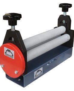 Rundbiegemaschine Standard-Profi, Arbeitsbreite 305 mm, Wellendurchmesser 36 mm, bis 2,0 mm Stahlblech, 4 Stück Drahteinlegerillen von 1-3 mm, zur Montage auf einem Werktisch (Einspannen in einen Schraubstock auch möglich mit einem großen Schraubstock) klein und handlich, Körper aus massivem Stahl, Halterung der oberen Welle an einer Seite zum Entnehmen, zum Entnehmen von ganz gerundeten Blechen, Wellen seitlich in Kunststoffbuchsen gelagert, Sicherheitsabdeckblech über den Zahnrädern, LxB Handhebel 195×145 mm, LxBxH (nur Gerät)=390x123x245 mm, LxBxH (incl. Handhebel waagrecht)=525x265x245 mm, Gewicht 13.100 gr.