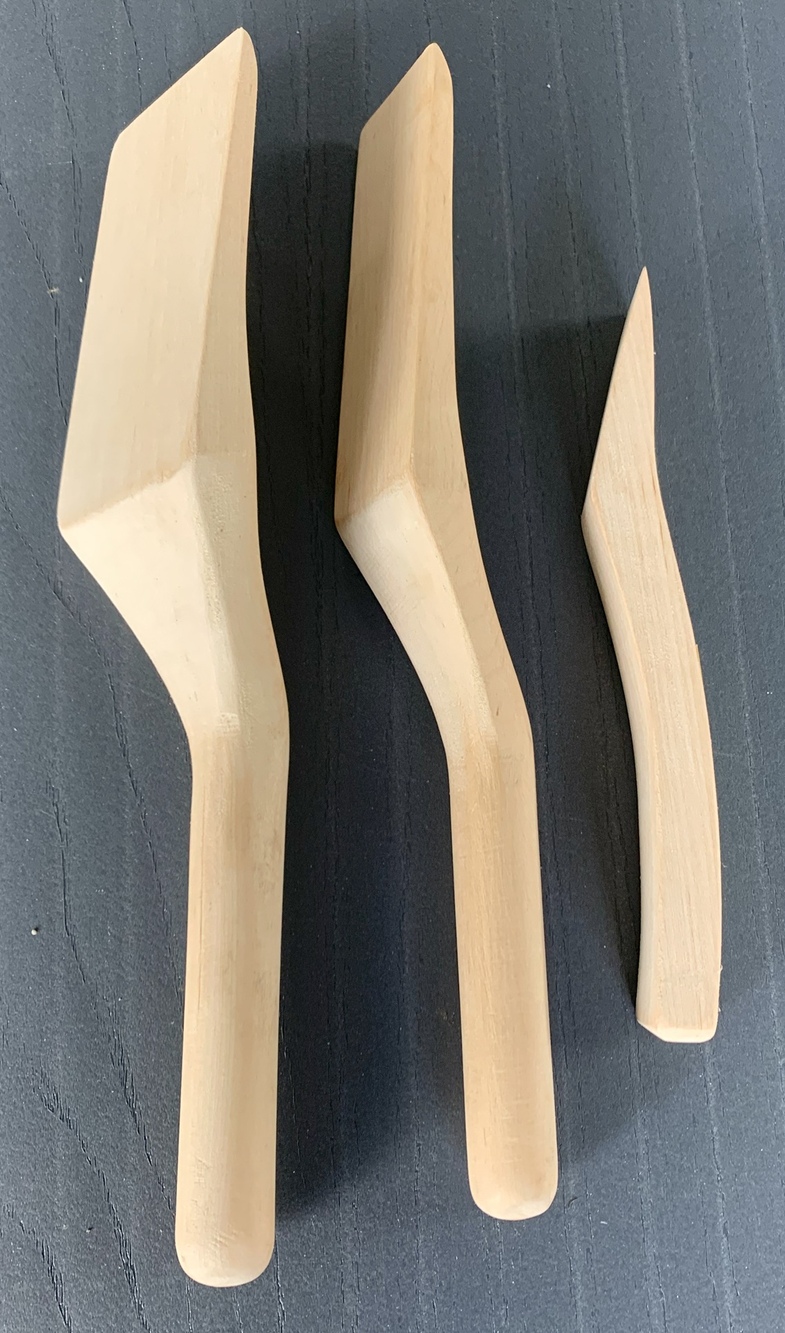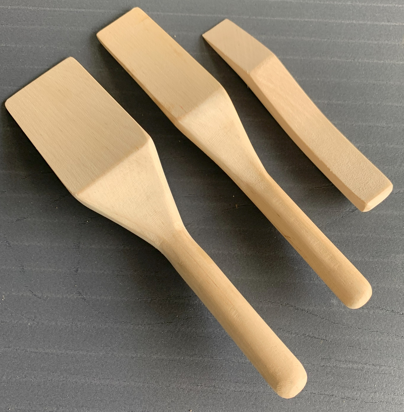 Satz Zinnhölzer (3-teilig) aus Holz, 3 Stück unterschiedliche Formen, Breiten der Spachteln 24+39+60 mm, Gesamtgewicht 162 gr.