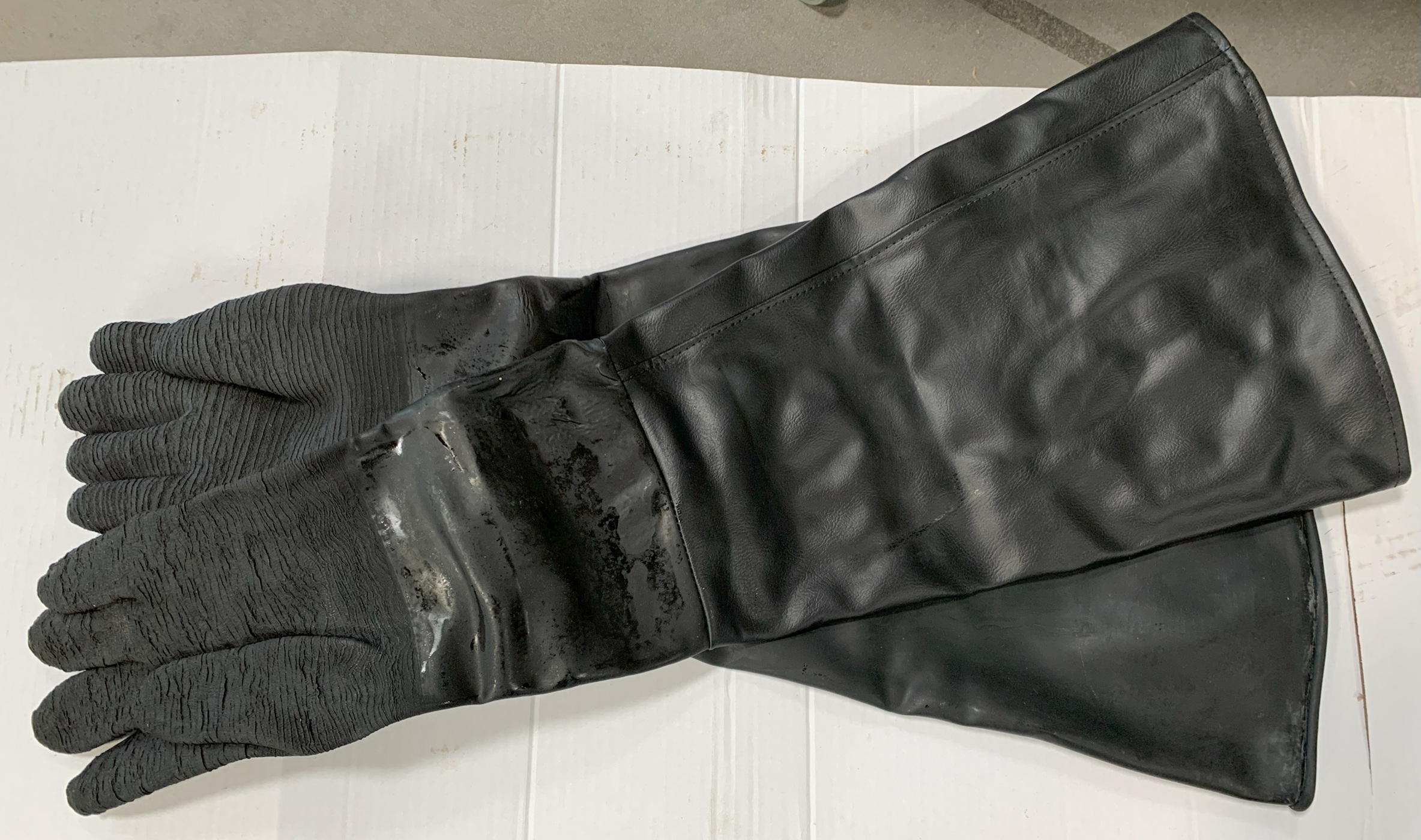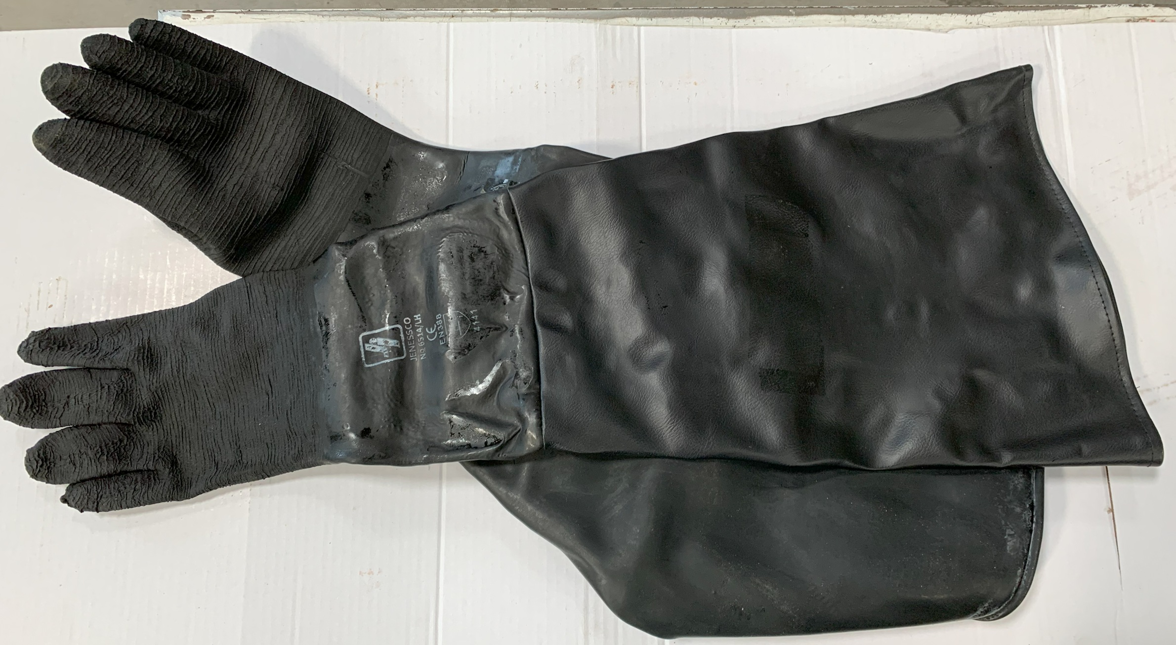 Sonderposten augenscheinlich unbenutzt, ehemalige Muster, liegen schon lange, wirken aber noch gut, teilweise optische Mängel (auch teilweise mit Aufkleber), etwas unterschiedliche Handschuharten: Strahlhandschuhe Profi (als Paar), 750 mm Länge, Breite am Einstiegsloch ca. 310+390 mm (flach gemessen), rechter Handschuh CE-Zertifizierung nach EN 388